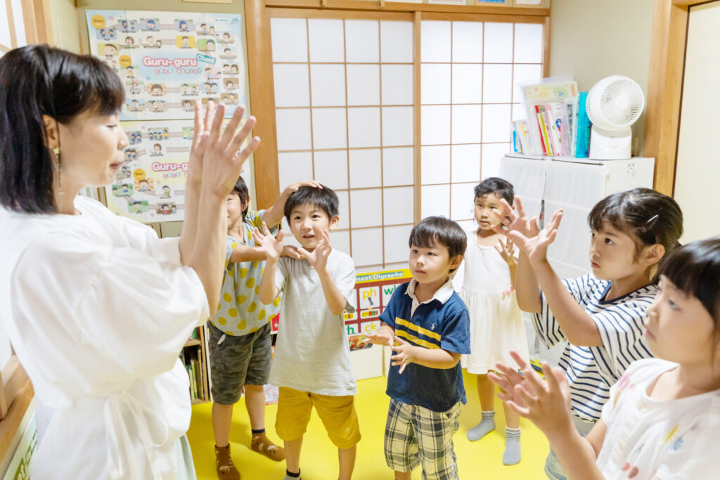 リズムや会話、文字指導、自己表現など多様なレッスン教材の組み合わせにより「聞く」「読む」「話す」「書く」の英語4技能をバランスよく身につける。
